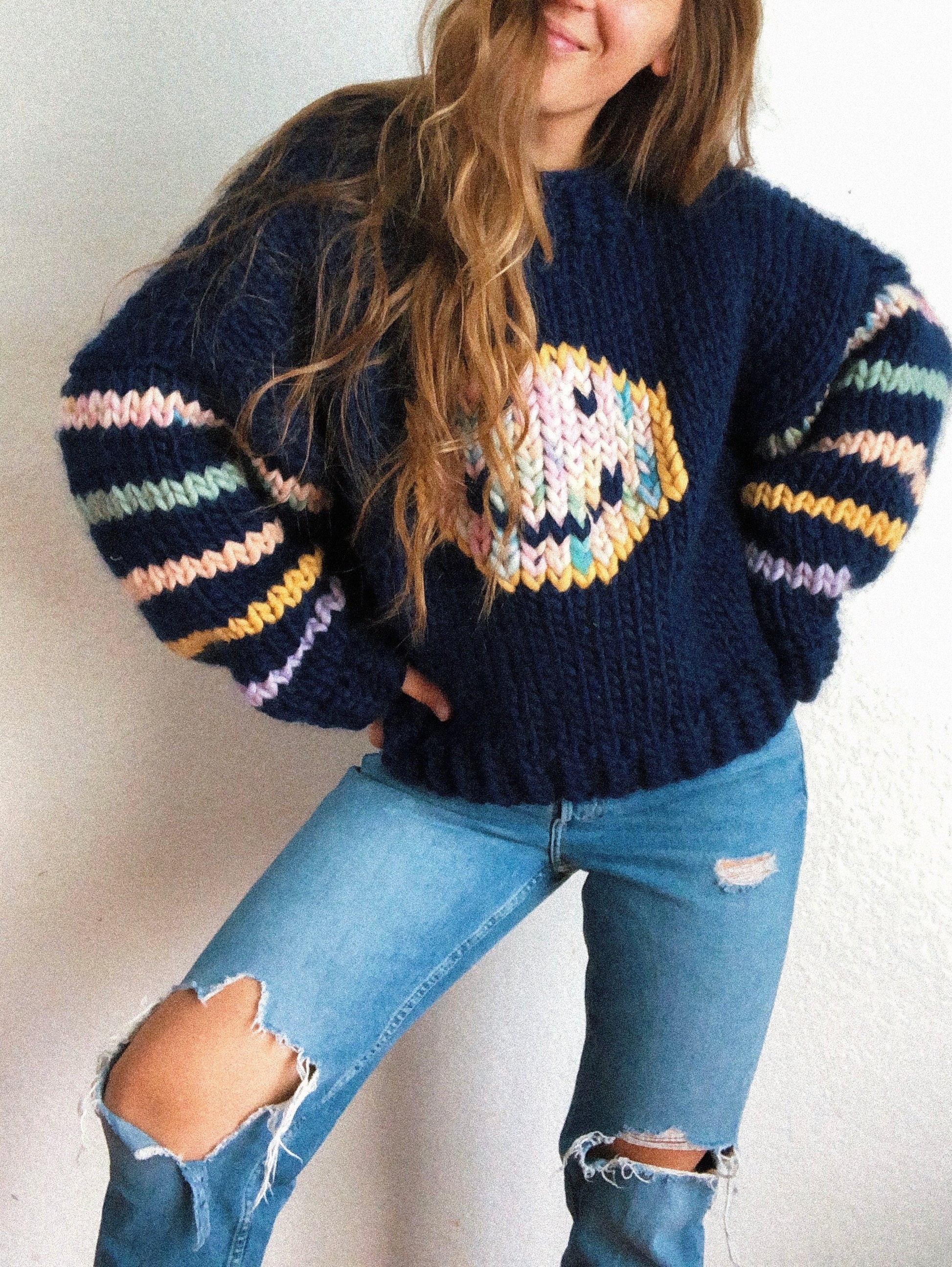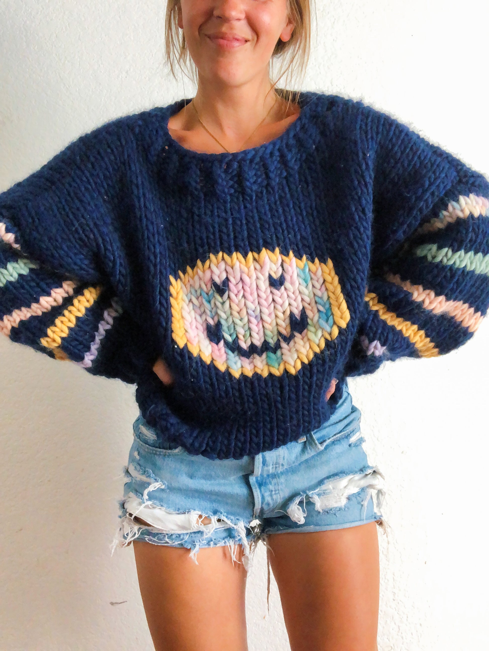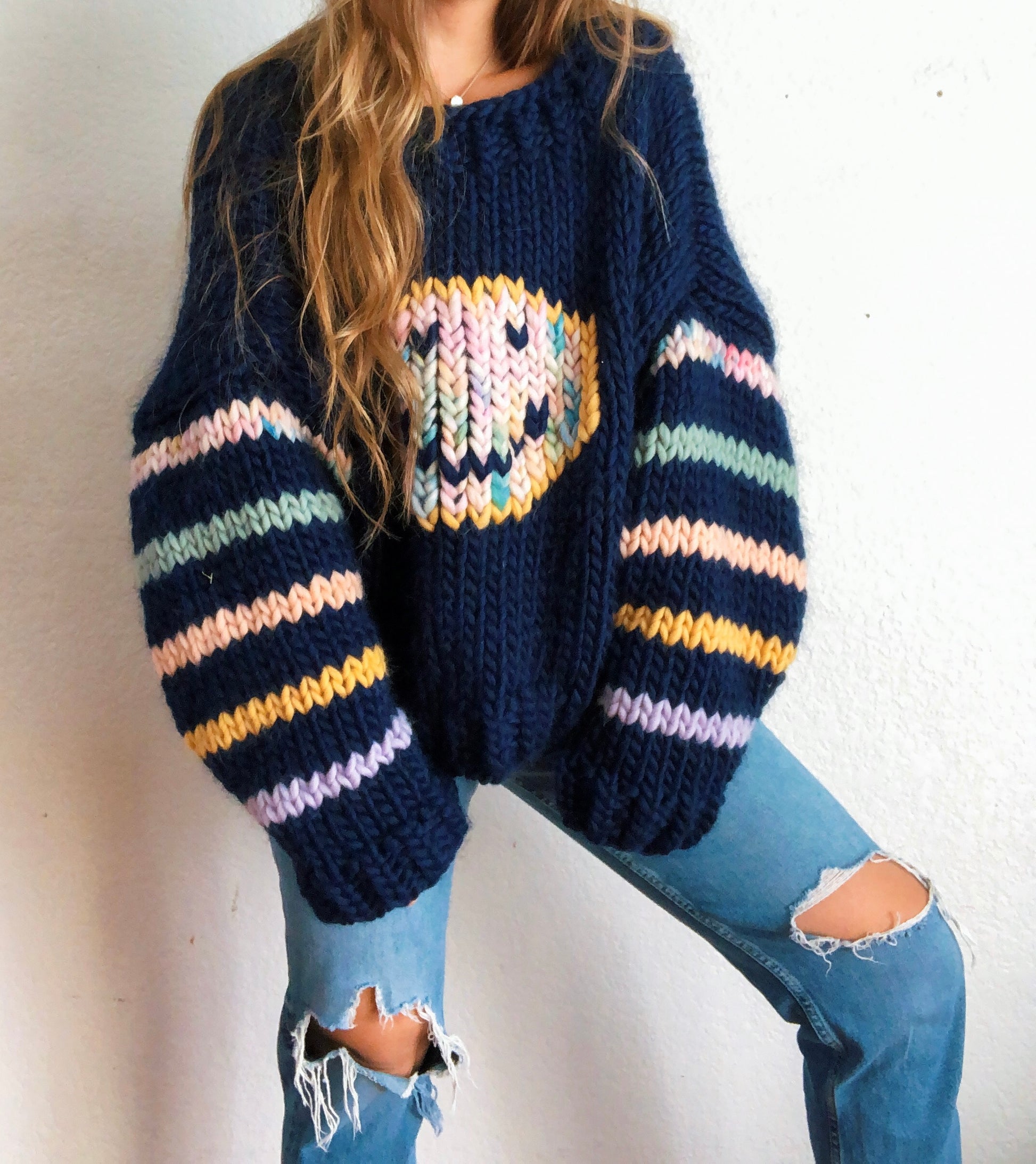 I’ve been wanting to do a smiley face design for awhile and this sweater turned out to be the perfect candidate! This is a very basic sweater pattern, stripes to add a little extra to the sleeves. It’s knit all in stockinette and twisted ribbing. The smiley face design is added on afterwards using the duplicate stitch technique. For reference, I do not instruct how to knit in my patterns. You need to know basic knitting skills.
