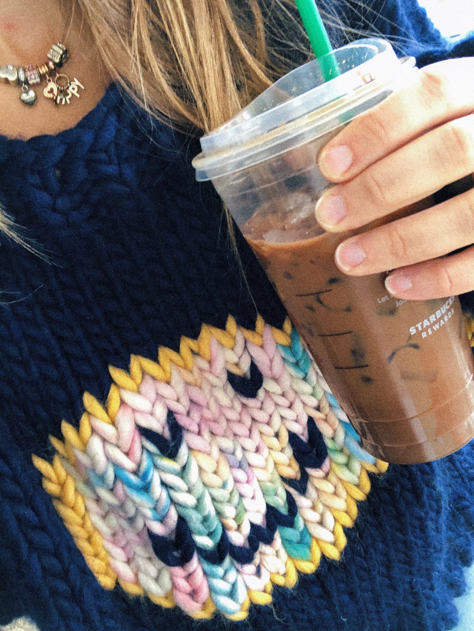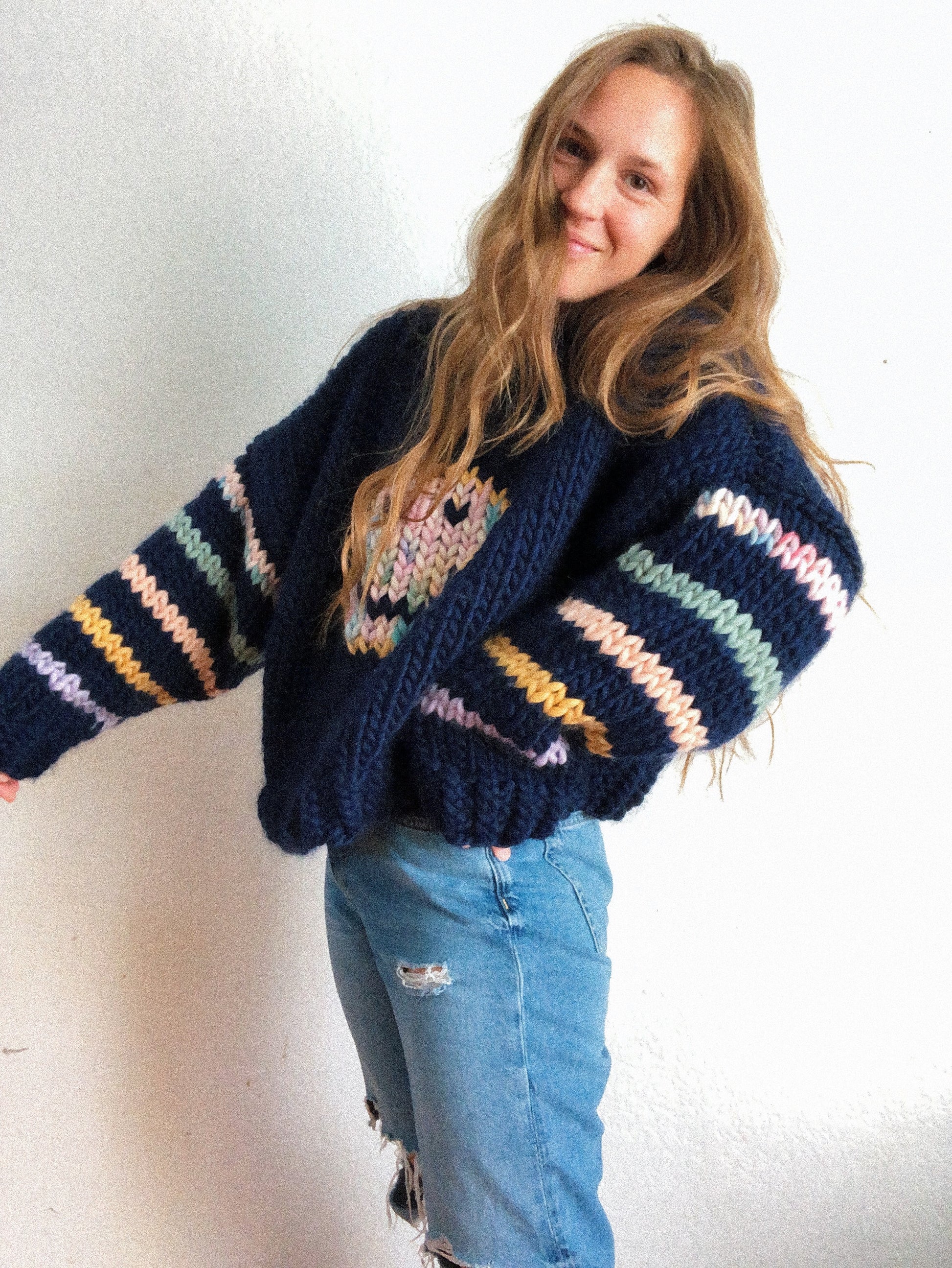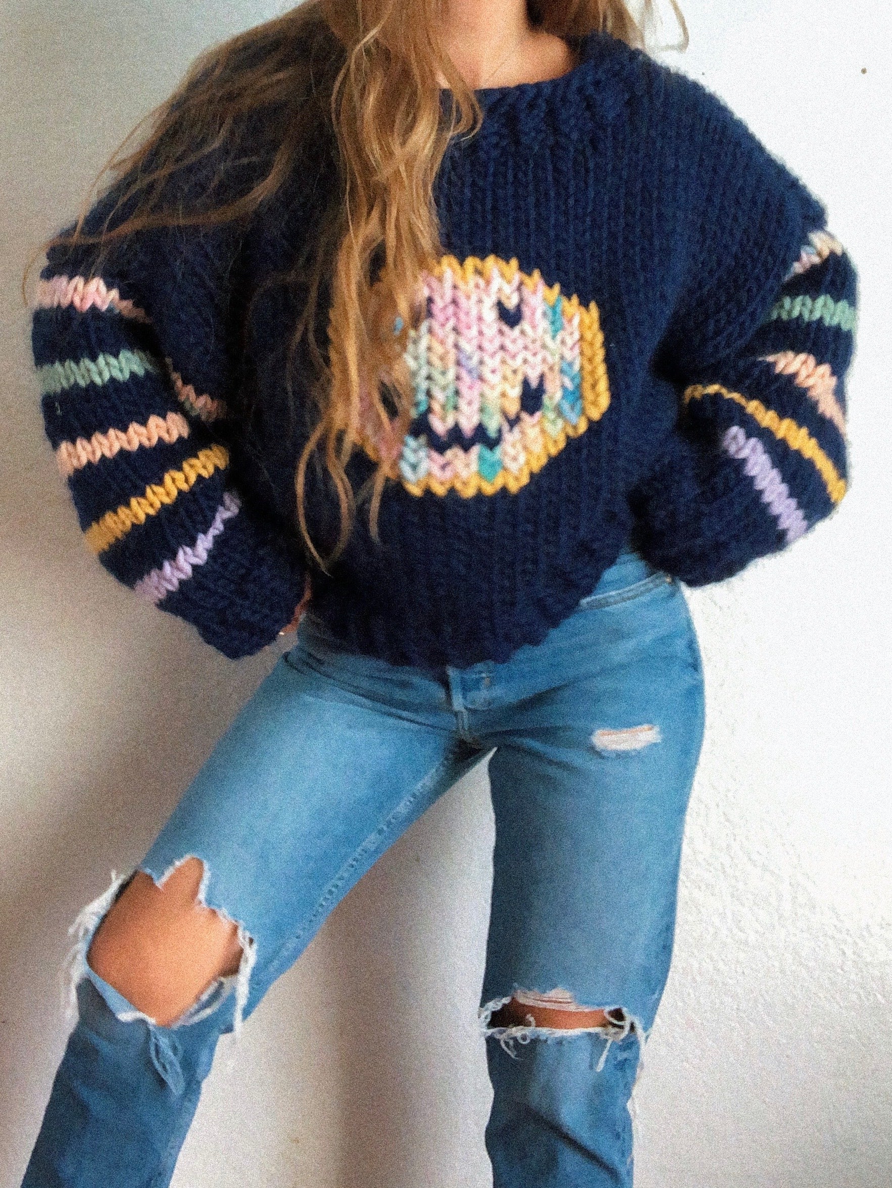 I’ve been wanting to do a smiley face design for awhile and this sweater turned out to be the perfect candidate! This is a very basic sweater pattern, stripes to add a little extra to the sleeves. It’s knit all in stockinette and twisted ribbing. The smiley face design is added on afterwards using the duplicate stitch technique. For reference, I do not instruct how to knit in my patterns. You need to know basic knitting skills.