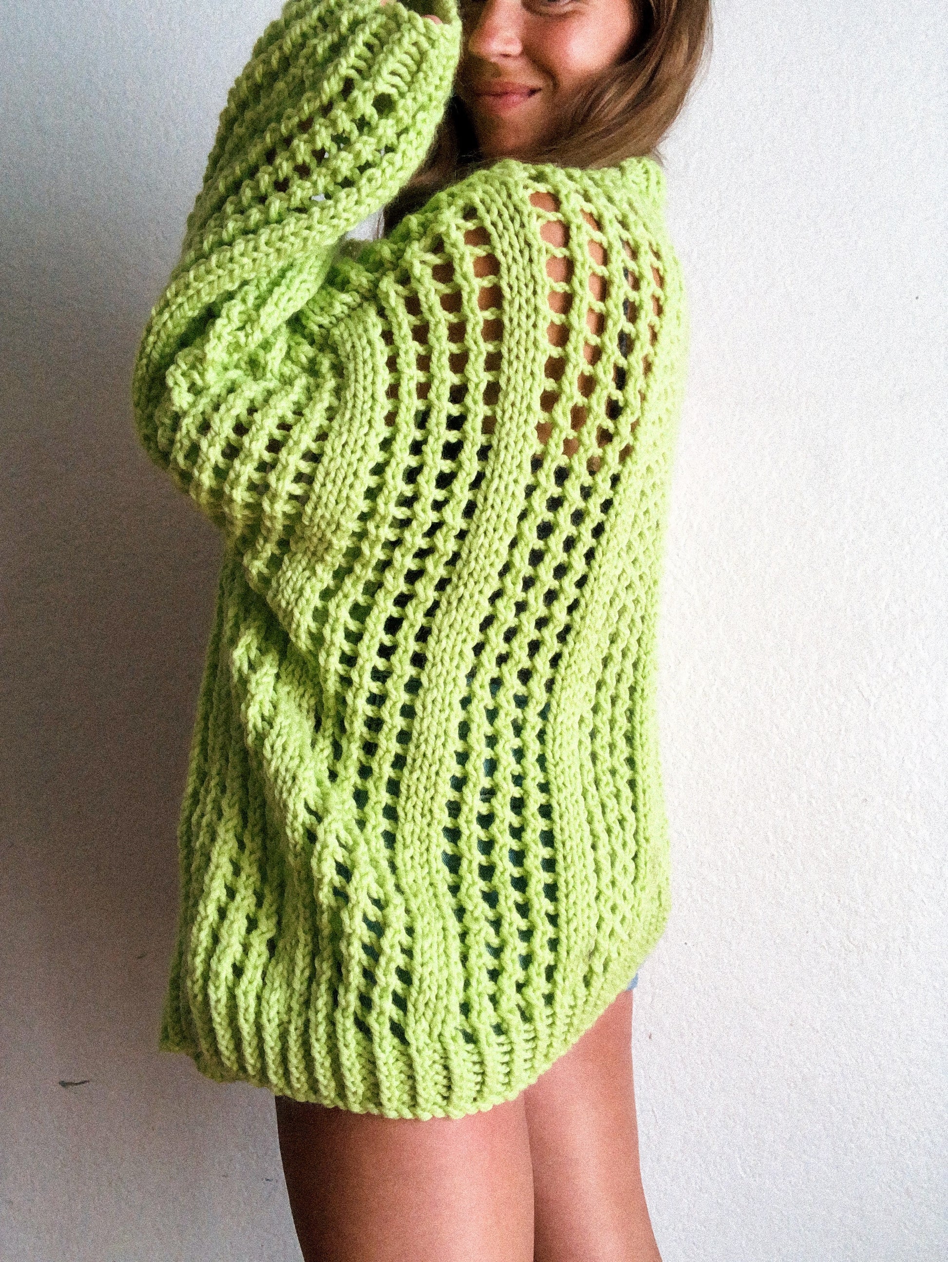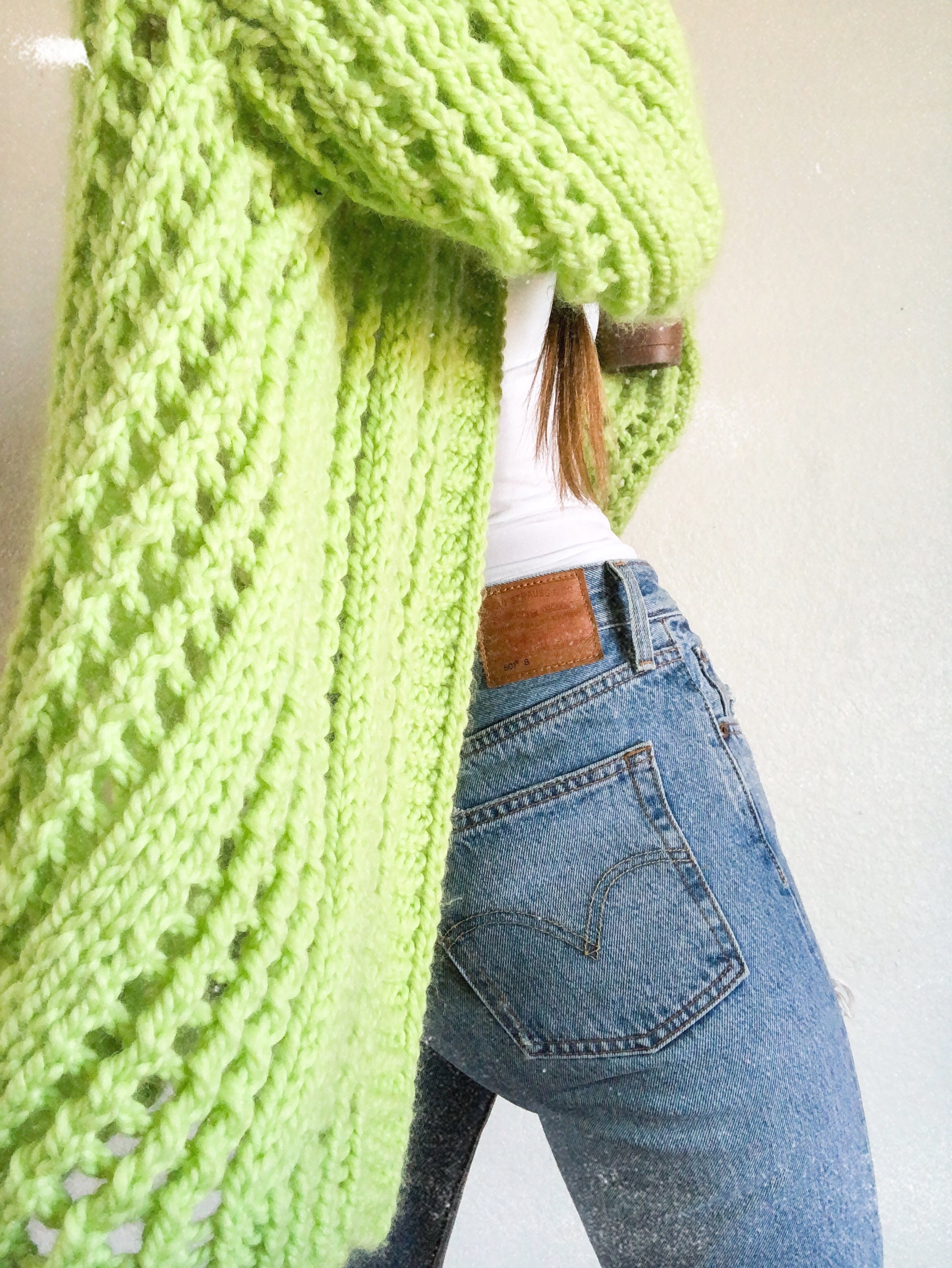 Your perfect summer cardigan is here! Knit up on larger needles for a quick knit, this one’s knit in an open mesh style stitch to be cozy but not hot. Perfect for throwing on for your morning coffee dates or evening beach/porch relaxes! This is a one size only oversized pattern.
