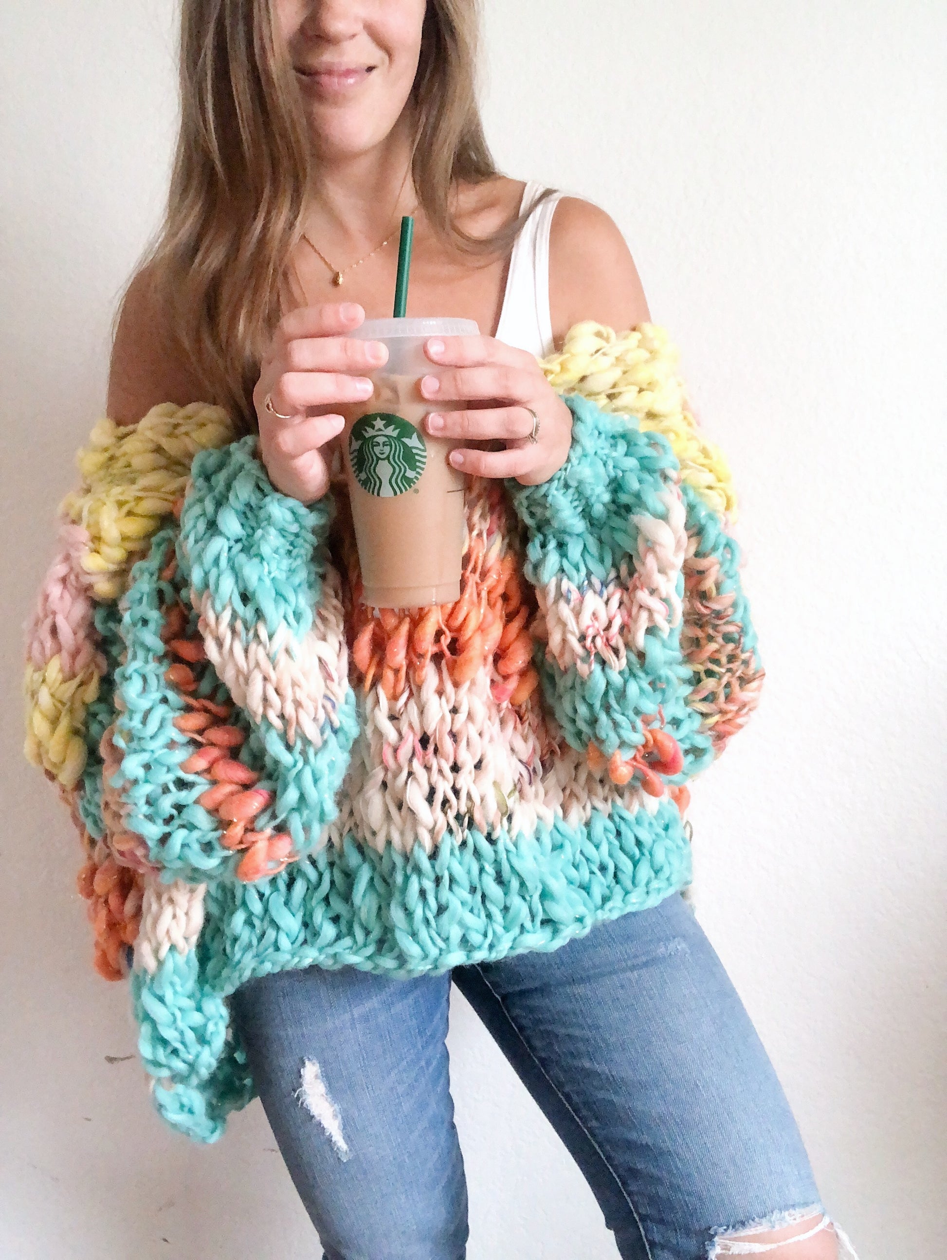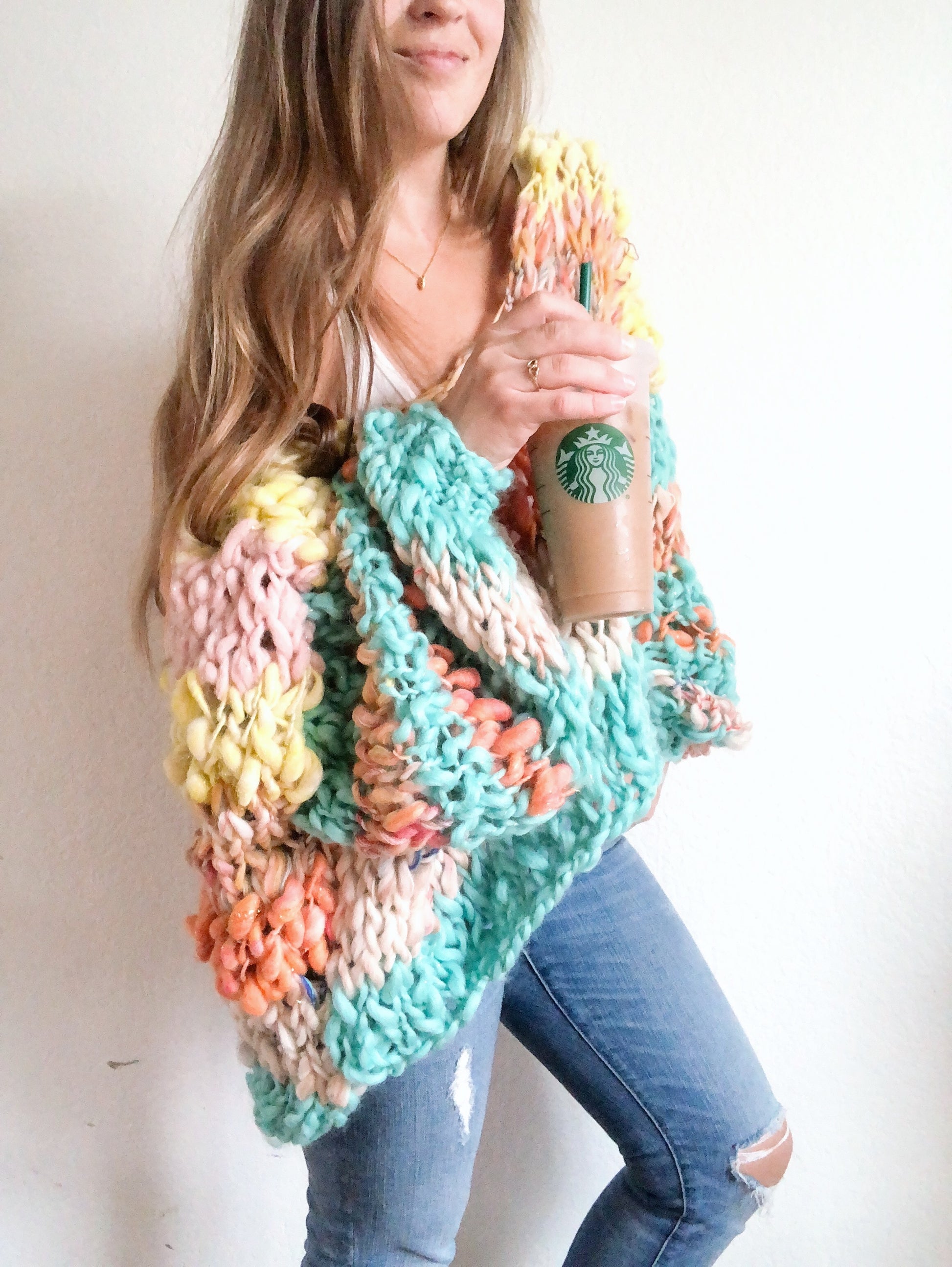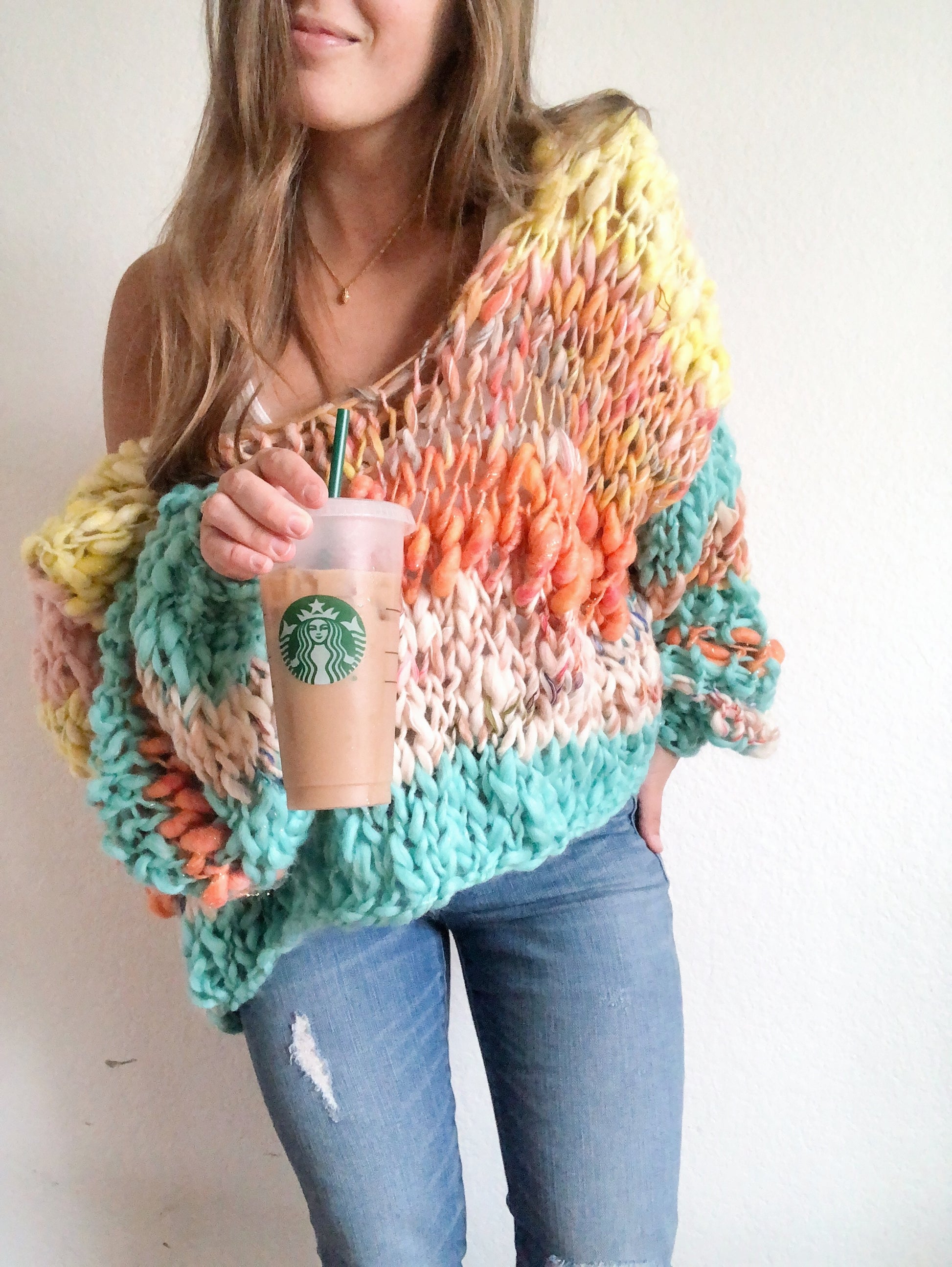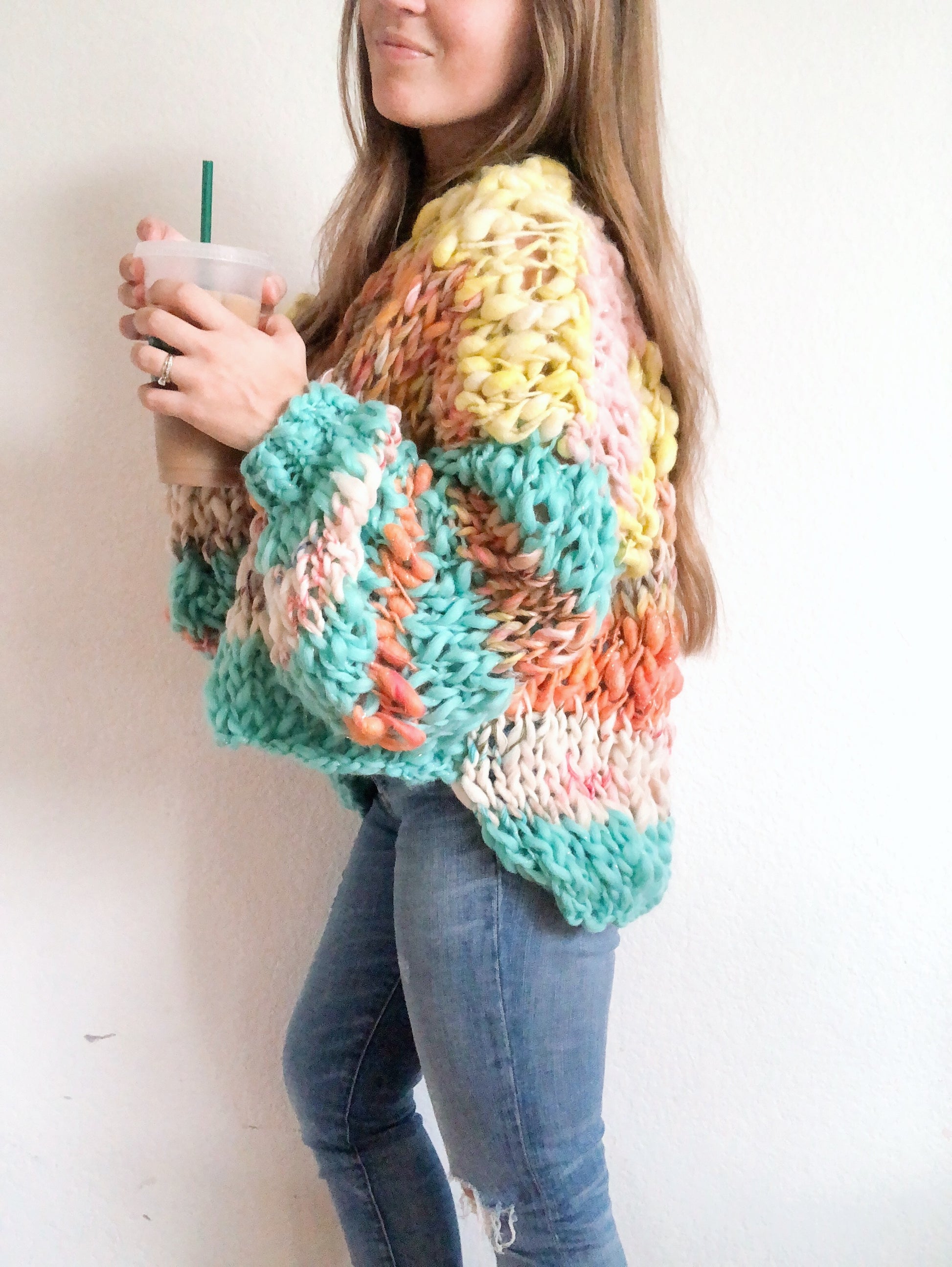 The Cozy Cuddler pullover knitting pattern! This is a super quick and fairly easy knit. This sweater can be worn either both sides off the shoulder or one side off. It’s basically for chilling out on the couch in the cold fall and winter months and being as cozy as if you were in a blanket! Add in the gorgeous bursts of color and you’ll be happy as all get out.