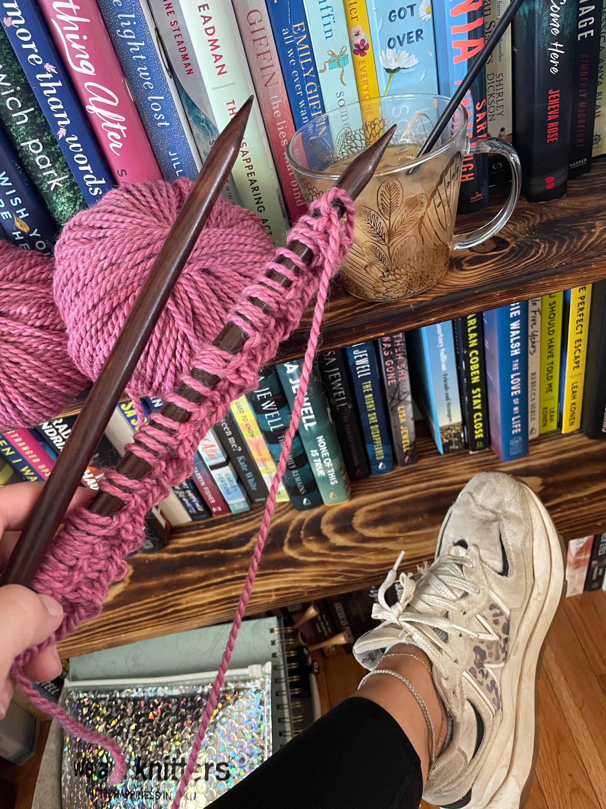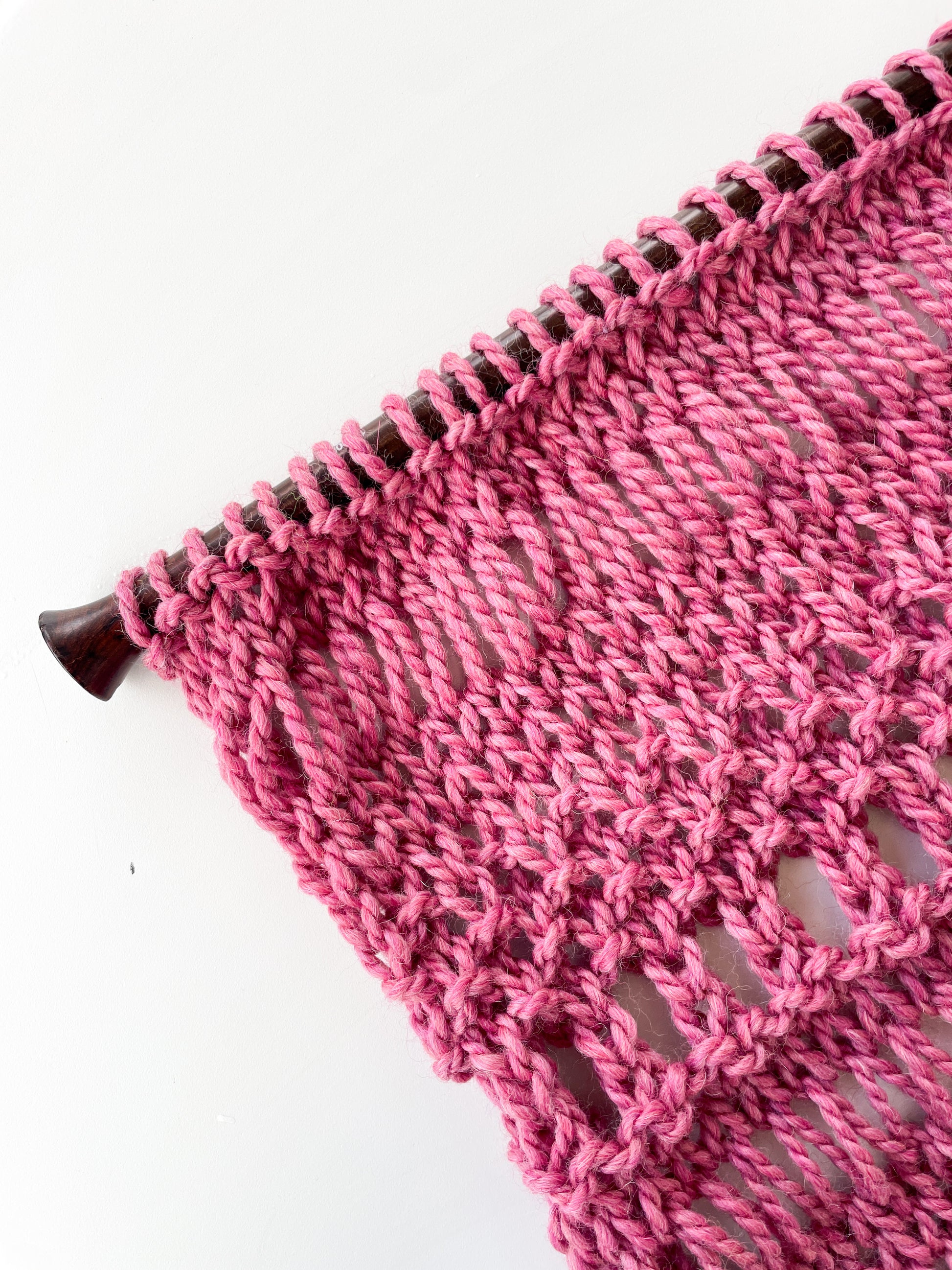 Longtail cast on, garter stitch, stockinette stitch, yarn overs, knitting two stitches together, drop stitch, moss stitch, bind off