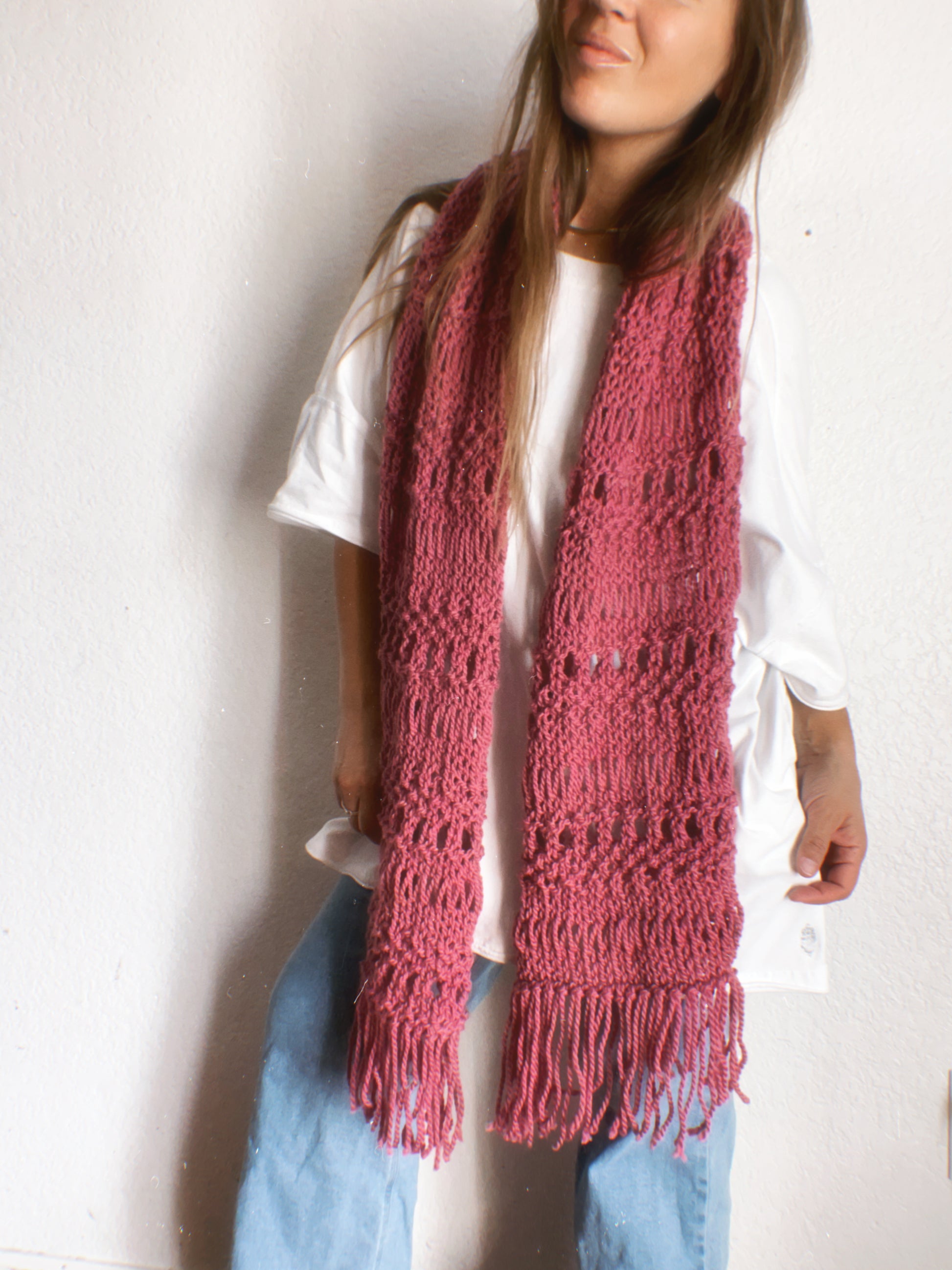 The Ozzy Scarf. Detailed with textured stitches and a delicate fringe. Your new must have pattern for your fall and winter knitwear collection. It's simple, fun, and an incredibly warm piece. You can become an expert at these basic stitches, working repeats, while creating a beautiful scarf.
