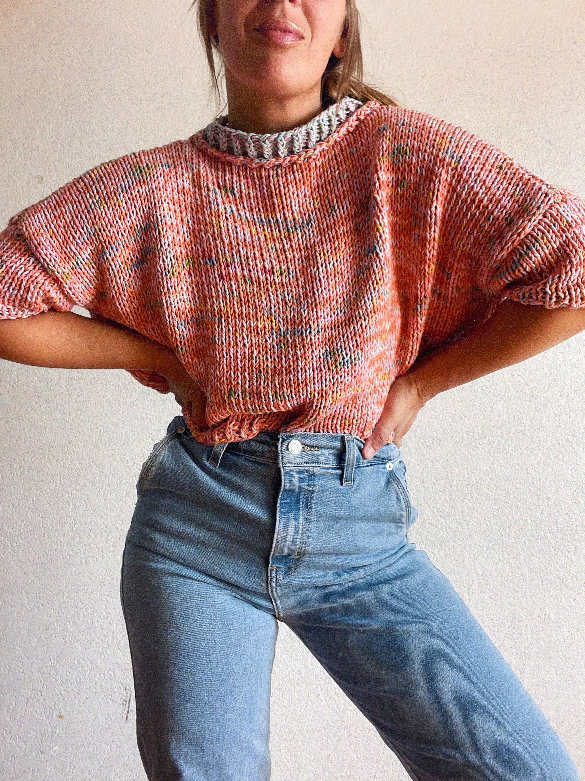 This oversized drop shoulder tee is created holding two strands of we are knitters cotton yarn together at once, creating a heavier, cozier, and warmer tee. Perfect for the end of summer and fall months! Layer it over a long sleeve for the perfect combo! This tee features a double neckline, meaning one edging of ribbing and then another edging of ribbing!
