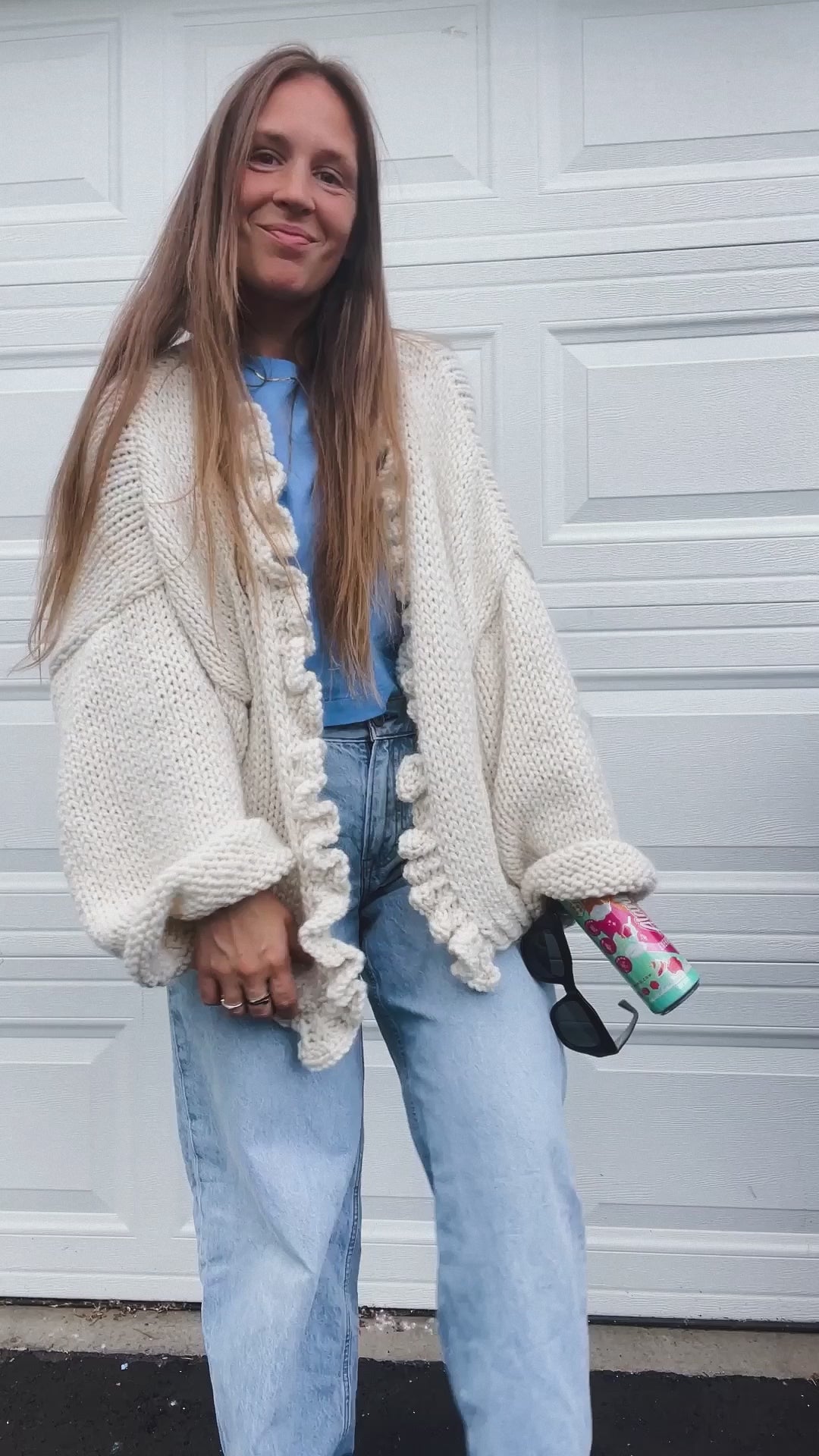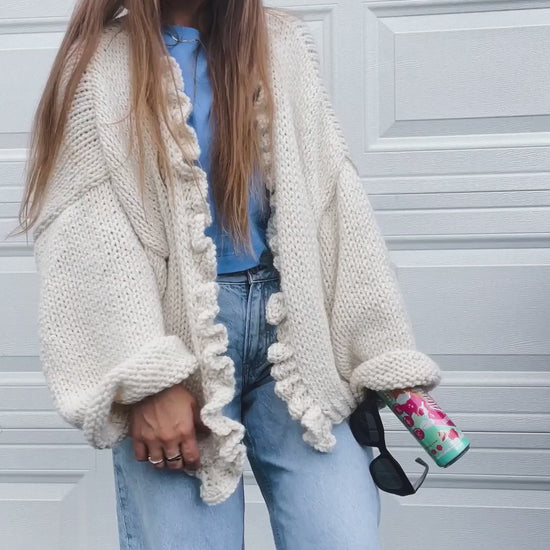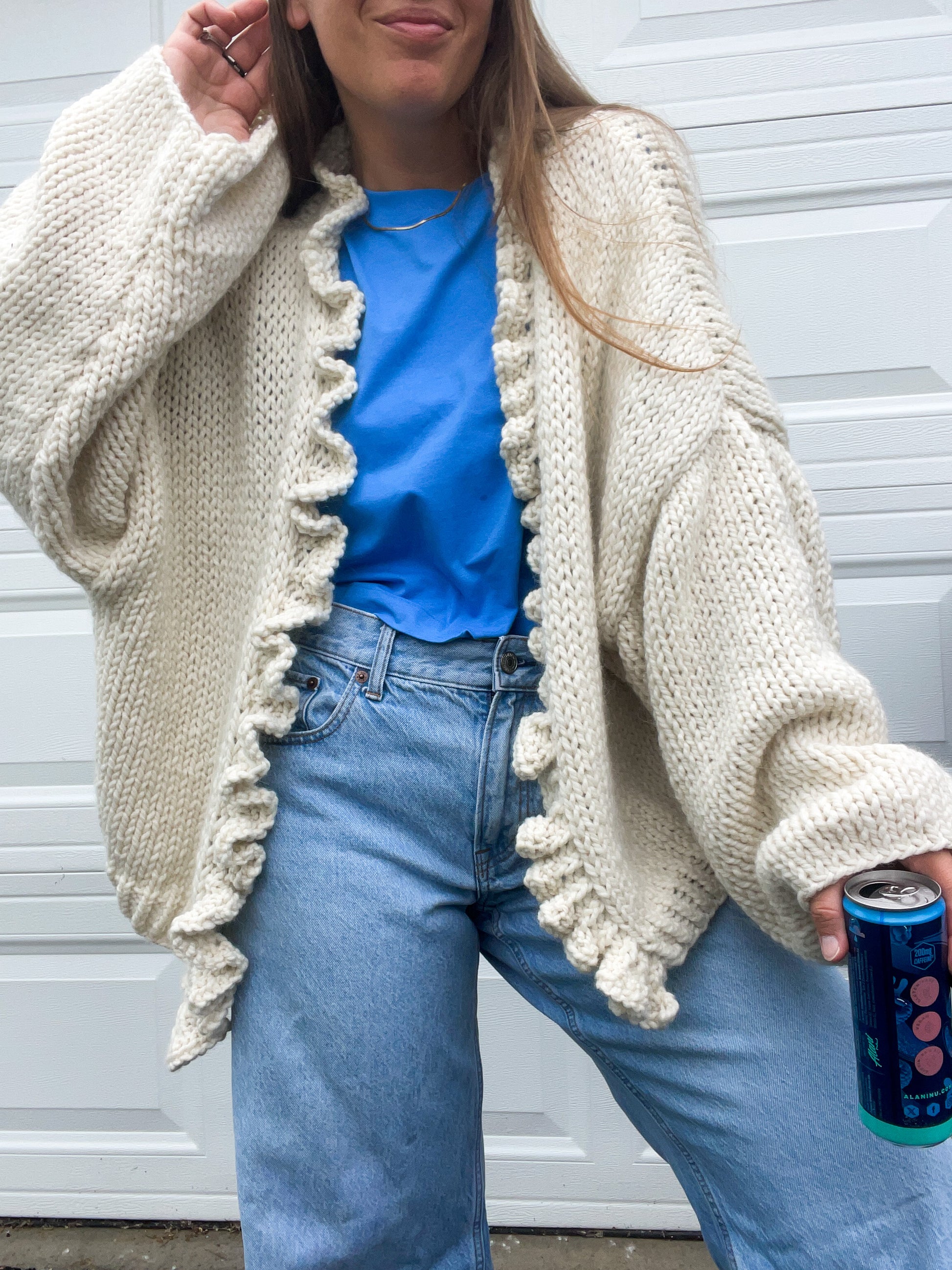 An everyday cardigan you need to make. Using the heavenly alpachino merino yarn from Wool and the Gang and size 12mm needles, this cardigan is a quick and easy knit. It's basic, but extra.