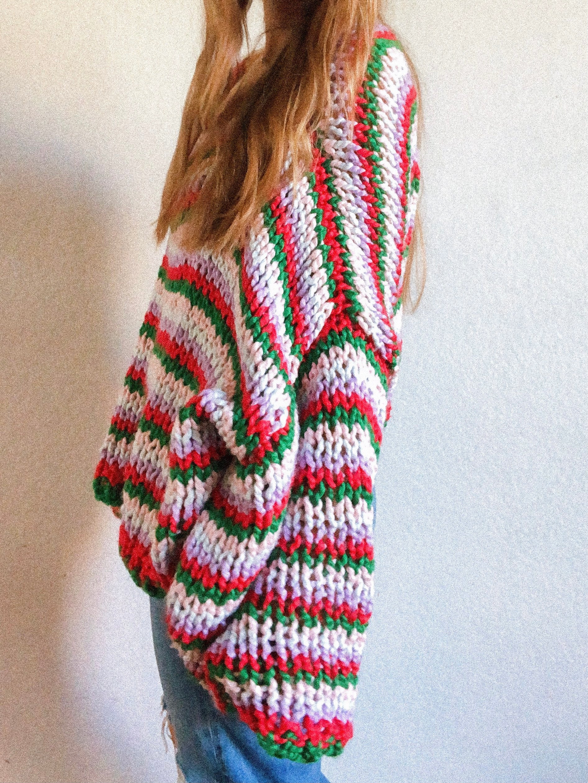 Who’s in the mood for a festive, happy quick knitting project? This sweater is waiting for you! Knit up on size 15 mm needles, it’ll be finished in no time. It boasts an oversized boxy body fit with very oversized, exaggerated sleeves. It’s cozy and will have you looking festive and fabulous all season long! This is a one sized oversized pattern. If you’d like to knit it larger or smaller, please follow the gauge for adding or subtracting stitches to tailor to your specific measurements. If you’d like help, please email me and I’m here to assist!:)